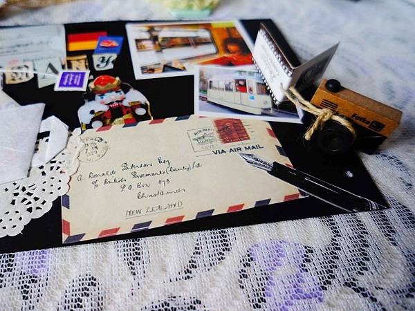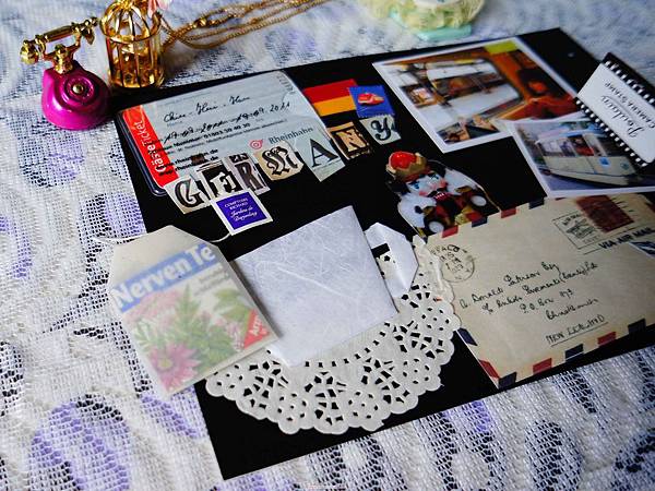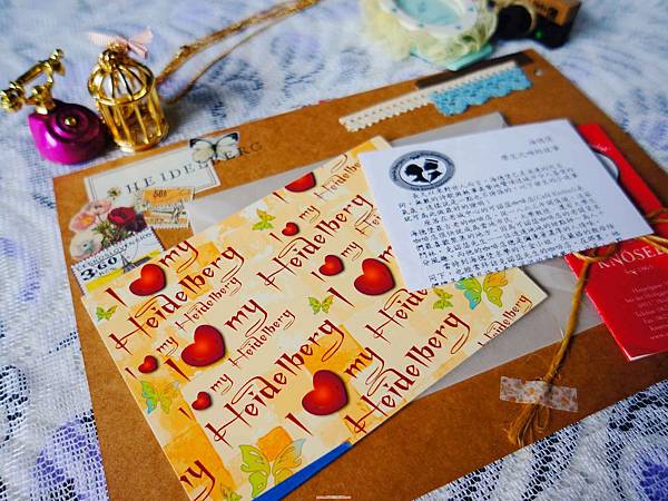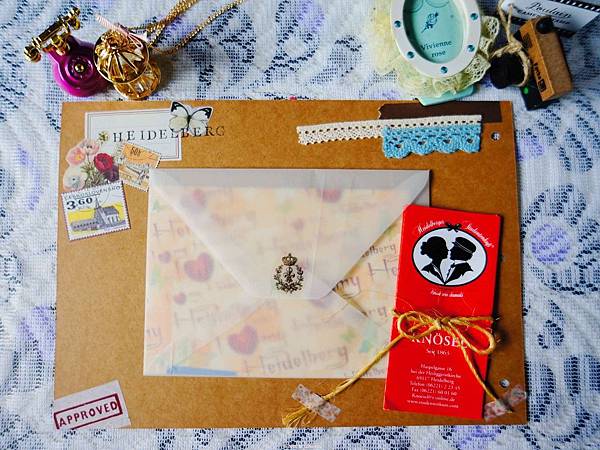 就以描圖紙製作信封,並把在海德堡寄的明信片和賣學生之吻巧克力獲得的中文解說放進去,