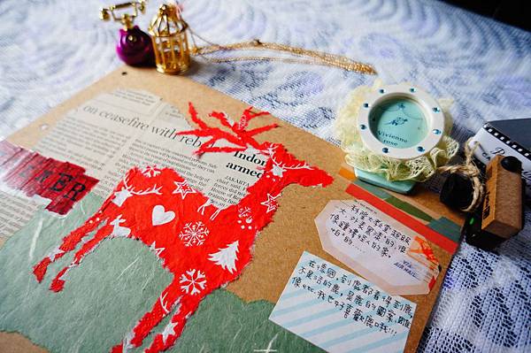 在德國買到了聖誕主題的紅色餐巾紙,思考好久要怎麼將它拼貼出來,