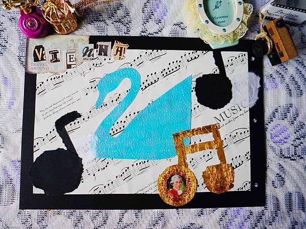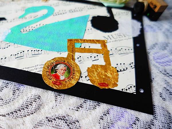 右下角是莫札特巧克力的外包裝,拼貼出音符,
