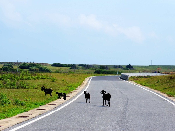 在七美的路上遇上小羊家族過馬路