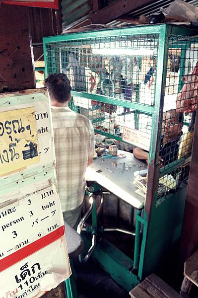 看到有一個人被關在籠子裡就是過河船的收費員